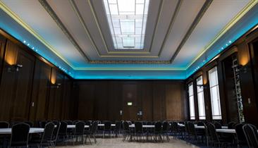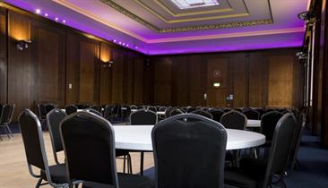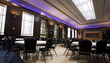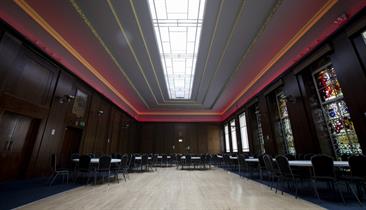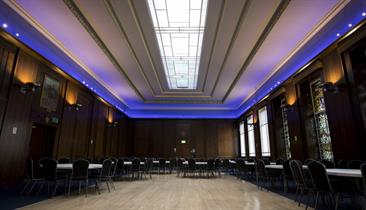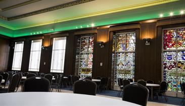 With a capacity of 180 in theatre style or 150 for dinner dance it has beautiful stained-glass windows, wooden dance floor, large bar and changeable feature lighting, the room is accessed through the grand entrance of the Crush Hall within Stoke Town Hall. The opulent staircase provides the perfect photo opportunity or grand entrance to your event.